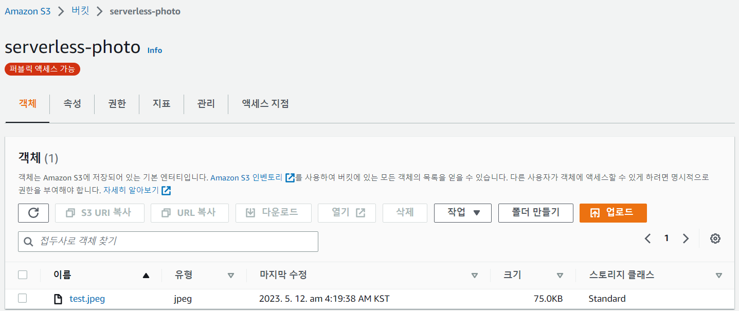 5. 이제 해당 버킷에 jpeg 이미지를 하나 올리면, 람다 함수가 실행됩니다.