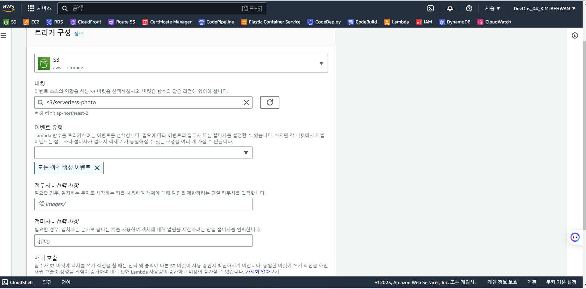 4.S3 버킷을 하나 만들고, 트리거로 연결합니다. 다음과 같이 설정합니다.
