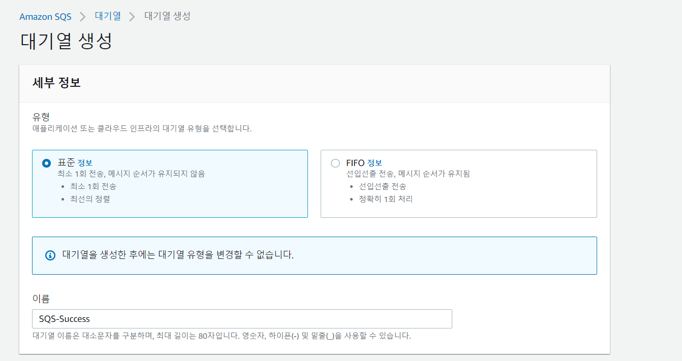 이름을 정해주고 나머지는 기본값으로 설정 후 대기열 생성 버튼을 클릭해줍니다.