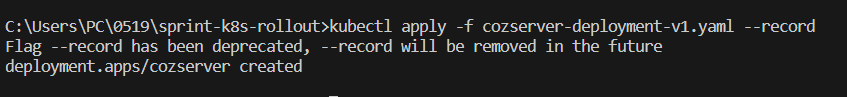 1 kubectl apply --filename=cozserver-deployment-v1.yaml --record=true