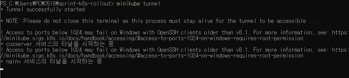 minikube tunnel 명령을 이용해 터널을 뚫어줍시다.