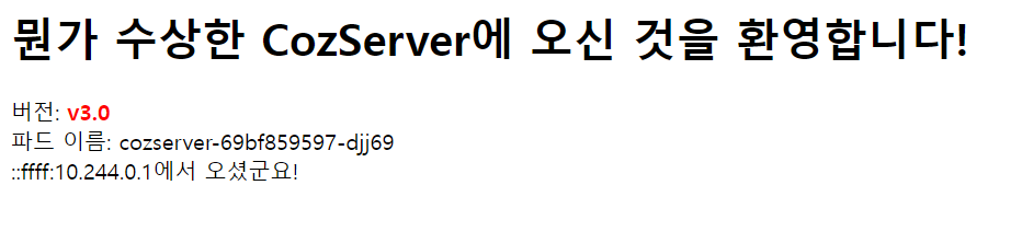 3.0 배포를 위해서 cozserver-deployment-v3.yaml 에 3.0 버전을 이용한 디플로이먼트 명세를 적고, kubectl을 통해 배포를 시도합시다.