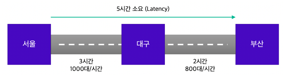 -> 서울-부산 간 Latency : 각 구간의 소요 시간 합계인 5시간