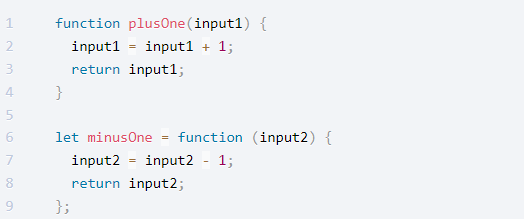 자바스크립트에서 함수는 두가지 방식으로 선언될 수 있습니다. 첫 번째 함수 plusOne은 함수 선언식입니다. 두 번째 함수 minusOne은 함수 표현식을 변수 minusOne에 할당했습니다. 미묘한 차이는 있지만 변수를 선언하고, 함수를 할당했다 라는 결론은 분명합니다.