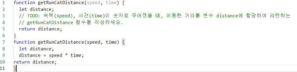 문제 : 속력 speed , 시간 time 이 숫자로 주어졌을 때, 이동한 거리를 변수 distance에 할당하여 리턴하는 getRunCatDistance 함수를 작성하세요.