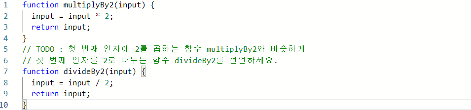 문제 : 첫 번째 인자에 2를 곱하는 함수 multiplyBy2와 비슷하게 첫 번째 인자를 2로 나누는 함수 divideBy2를 선언하세요.