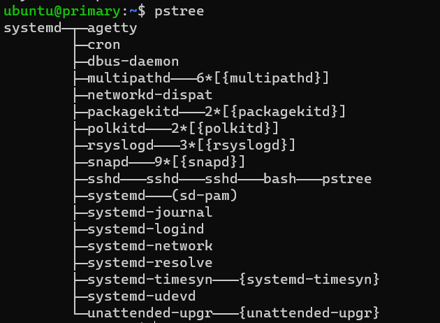 컴퓨터의 전체 프로세스를 구조화하여 확인하고 싶을 때는 pstree 명령을 사용합니다. 이 명령을 사용하면 다음과 같이 트리구조로 도식화하여 프로세스를 확인할 수 있고 부모 관계를 한 눈에 파악할 수 있습니다. 이 명령에 사용되는 옵션에 대해서는 man pstree 명령을 통해 학습하시기 바랍니다.
