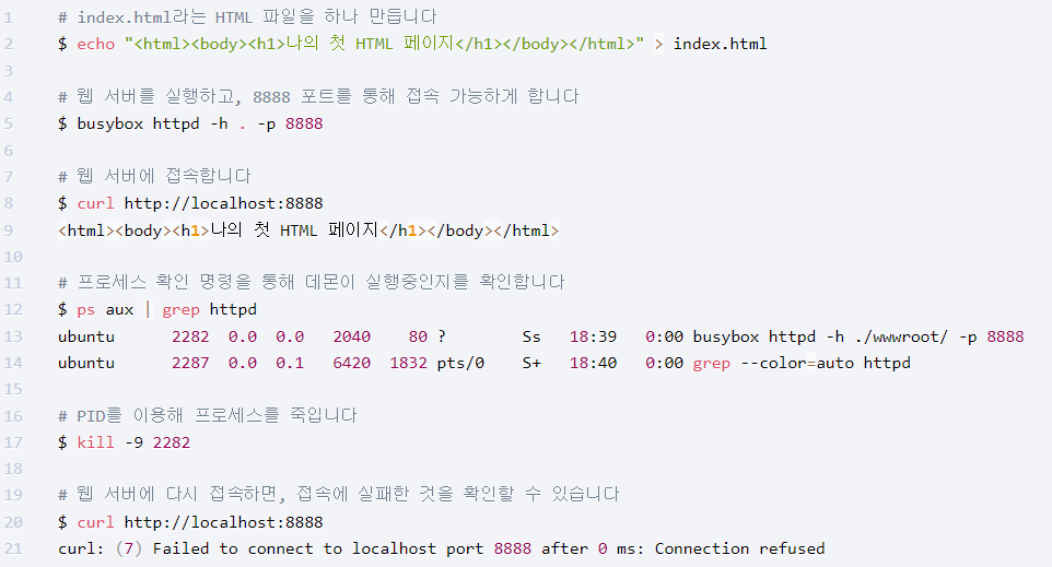 다음 예제는 간단한 HTML 파일을 만들어 웹 서버에 띄운 후, curl 이라는 유틸리티를 이용해 해당 주소로 접속해보는 실습입니다. curl로 해당 주소에 접속할 때, 접속 여부에 따라 웹 서버가 데몬으로 작동되고 있는지 아닌지를 확인할 수 있습니다.