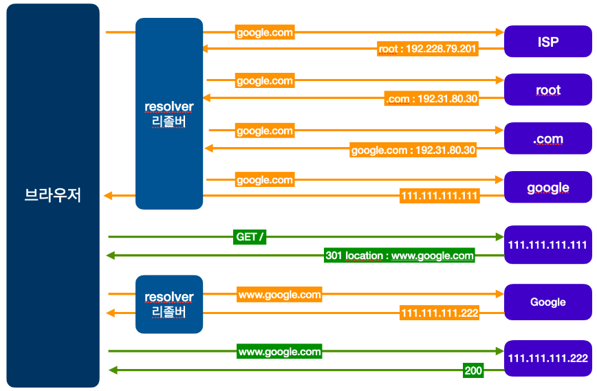 이러한 일련의 과정을 통해 브라우저는 http://google.com에 대한 IP 주소를 찾고, 해당 IP 주소로 HTTP 요청을 보내서 웹 페이지를 검색할 수 있습니다.