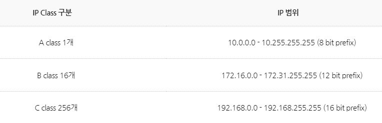 Private IP는 네트워크(Network) 안에서 사용되는 주소.( 내부적으로 사용되는 고유한 주소 )로 사설 IP는 하나의 네트워크 안에서 유일하며. 사설 IP(private IP)는 이 이름에서 보듯이 인터넷상에서 확인할 수 없고, 내부 네트워크에서만 사용 가능한 IP를 말합니다. 가정이나, 소규모 사무공간에서 공유기 / 라우터 등의 장비가 하나의 공인 IP를 할당 받고 NAT방식을 통해 여러 컴퓨터가 나누어 쓰는 방식으로 사용될 때 주로 사용되며, 아래의 표와 같은 B, C class의 사설IP 대역이 많이사용됩니다.