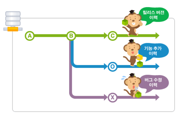 이럴 때, 여러 개발자들이 동시에 다양한 작업을 할 수 있게 만들어 주는 기능이 바로 '브랜치(Branch)' 입니다. 각자 독립적인 작업 영역(저장소) 안에서 마음대로 소스코드를 변경할 수 있지요. 이렇게 분리된 작업 영역에서 변경된 내용은 나중에 원래의 버전과 비교해서 하나의 새로운 버전으로 만들어 낼 수 있습니다.