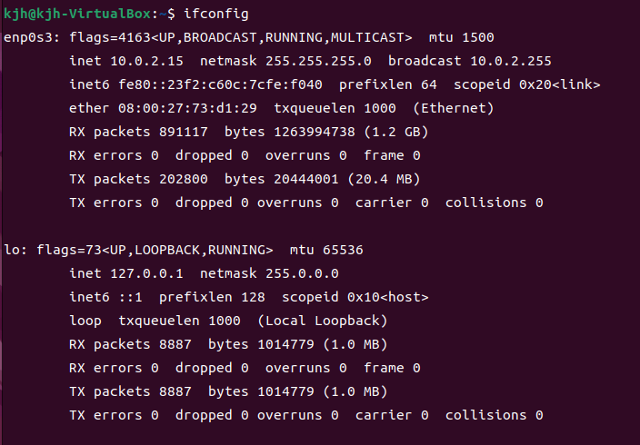"enp0s3"는 이더넷 인터페이스의 이름을 나타냅니다. 그리고 "flags=4163"은 이 인터페이스의 속성을 나타내는 플래그 값을 표시합니다.